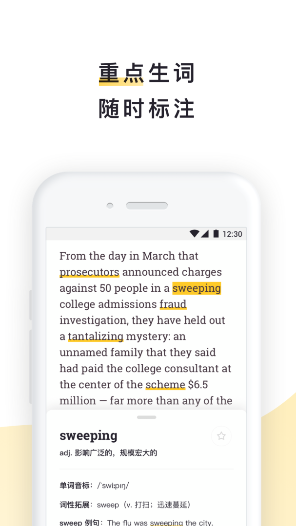 软件中设有重点生词随时标注的功能,便于用户记录和背诵新学到的单词,这种设计极大地简化了词汇学习的过程,帮助用户更快地扩大词汇量。