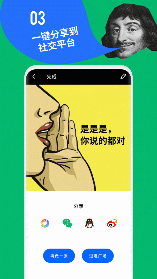 1、App自带图片库图片素材丰富,各种搞笑图、梗图、meme图、gif表情包,心情签名、朋友圈素材,鸡汤配图、早安/晚安语录配图等,一应俱全。(图片来源自用户上传和设计师手绘)。可以制作表情,方便随时扩充搞笑斗图表情包;熬制鸡汤,方便又励志;