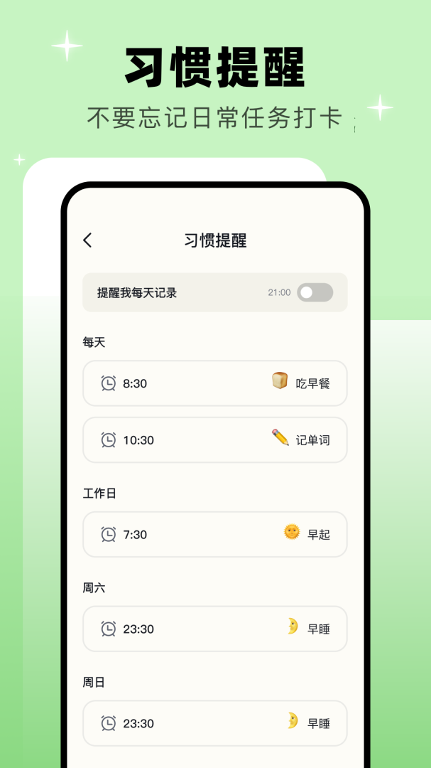 4、提醒功能:拥有定时提醒功能,方便及时回顾安排学习计划,避免拖延和忘记重要任务