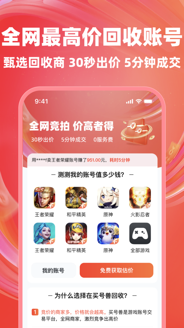 买号兽作为游戏账号交易平台,里面拥有很多大神的账号,可以进行交易,也能租借,快速的进行账号评估,可以高价的回收,买的账号还终身包赔,一些热门的游戏平台都包含有,让你在游戏中当大神,一起来看看吧