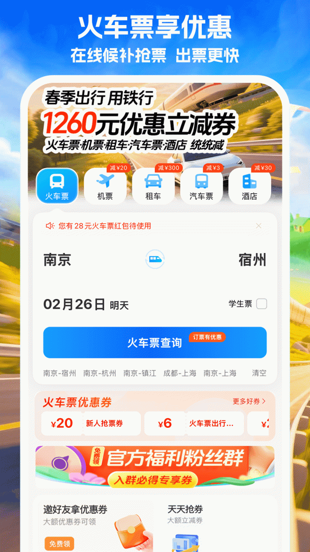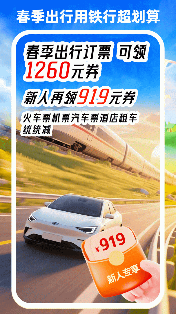 新人专享919元出行优惠大礼包 火车票、机票、租车、汽车票、酒店都可减