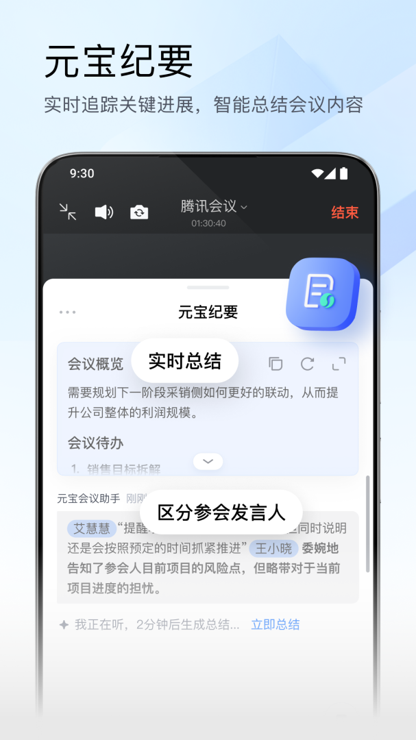 会中开启转写,支持实时精准翻译和元宝纪要总结。