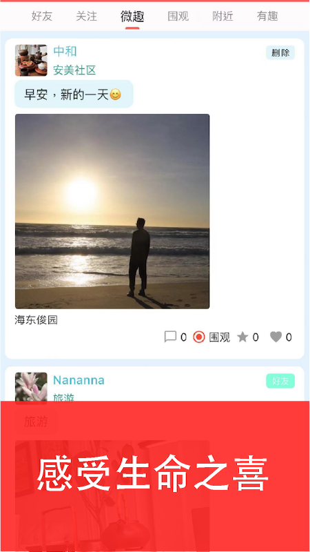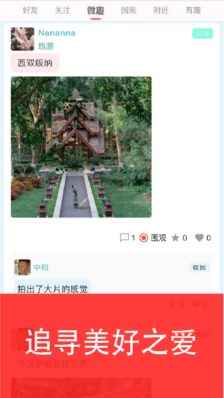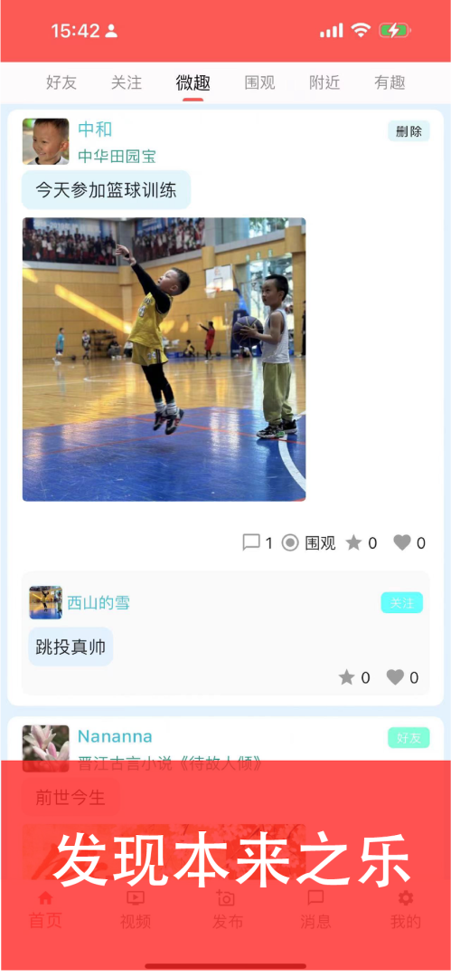 好友、关注、附近等频道分类清晰,刷 “附近” 能看到邻里的生活分享,“微趣” 频道藏着不少小众精彩。遇到合心意的内容可直接评论互动,一键关注就能跟进同好动态。界面清爽无杂乱,不管是分享日常还是结识邻居,体验都很愉悦!