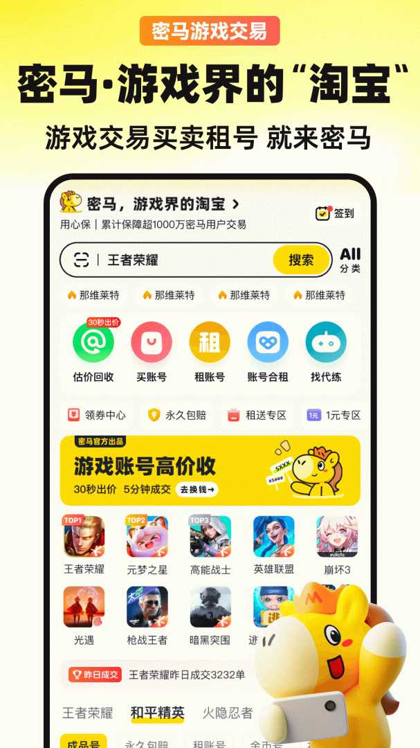 DNF、王者荣耀等热门手游端游全覆盖,不管是买号、租号还是找代练都超方便。大数据管控+人工客服双重保障,交易时从不怕盗号,售后有问题响应也快。之前租了个王者贵8账号,验号流程正规,用着特别放心!