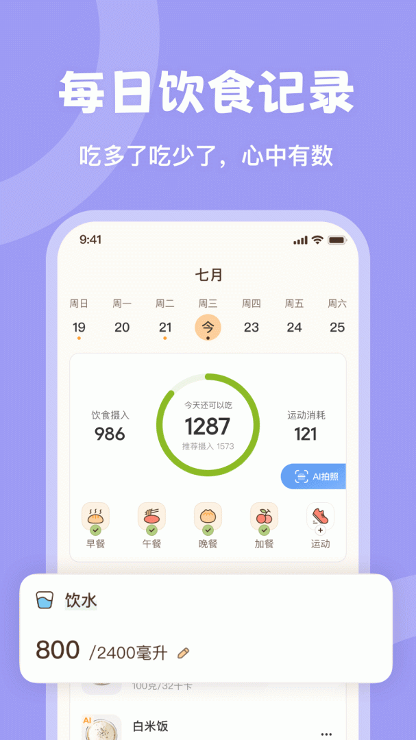 实时记录与跟踪功能,便于用户监控自己的饮食和体重变化,增强自律性。
