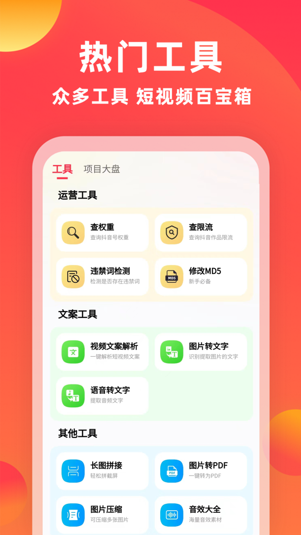我们提供强大实用的创作工具,包括视频提取文案、违禁词检测、数据监控、账号诊断、账号估价、视频镜像、MD5修改、图片转文字、语音转文字、长图拼接以及自媒体权重查询工具等,助你轻松完成创作过程,紧跟潮流,与时代同行,创作无限可能。