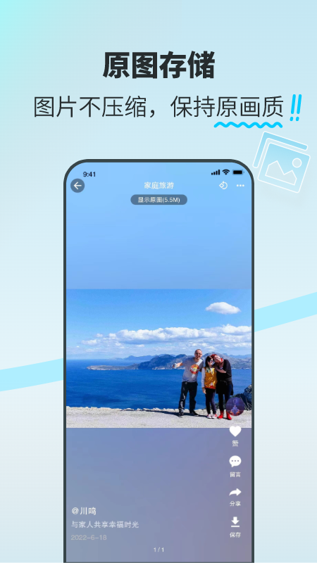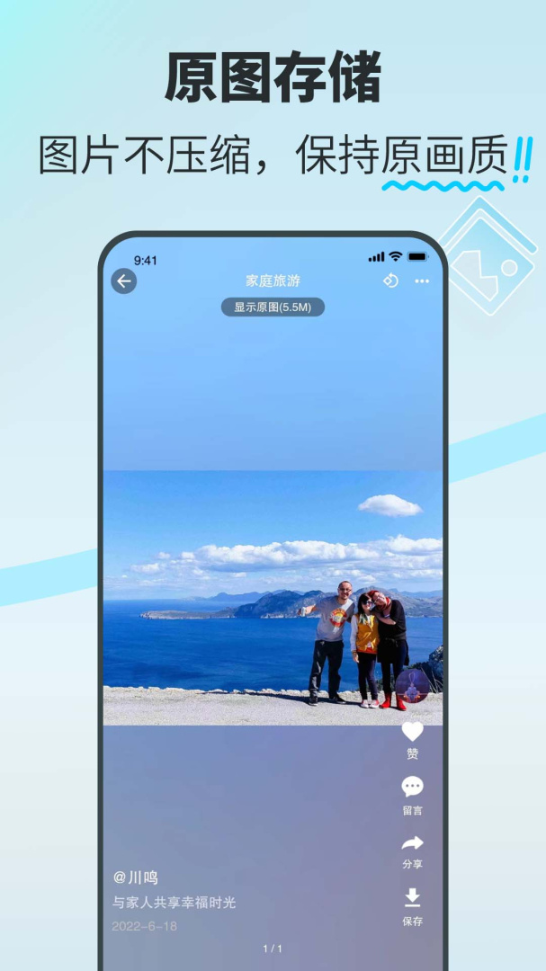 实时共享群相册,支持多人同时上传、浏览、评论、点赞、聊天,随时和亲友分享互动。