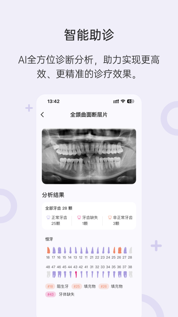 支持对全景片、侧位片、侧面像、正面像、微笑像、口内照、口扫模型等资料进行智能分析。