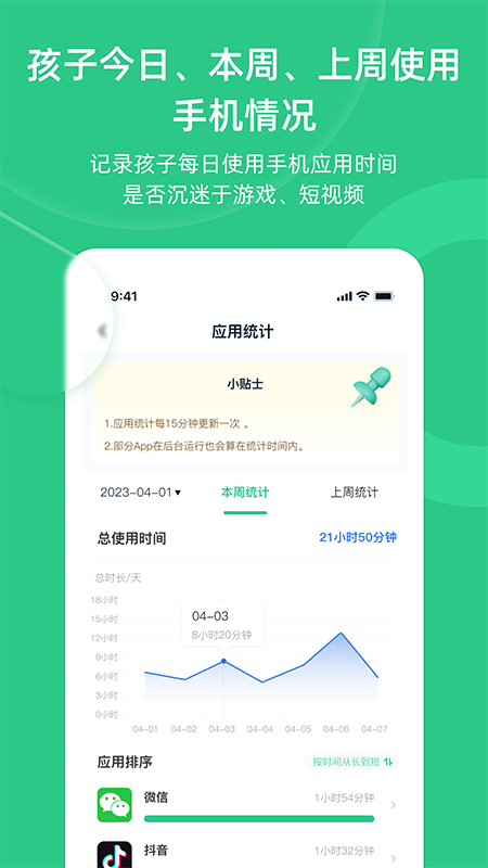 详细统计孩子每日使用手机总时长及单个应用使用时长,按时长排序,让家长一目了然。