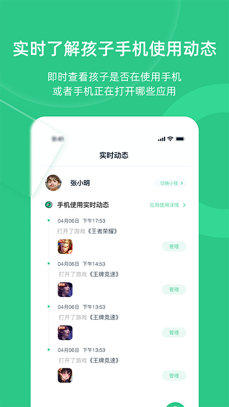 防止孩子沉迷于手机。还能实时监管孩子手机使用情况,帮助家长更好地守护孩子成长,增进亲子关系