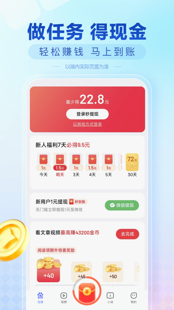 签到、阅读、看视频、邀请好友……完成简单任务即可获得金币奖励,金币可1:10000兑换现金,手动提现,真实可兑,收益看得见!