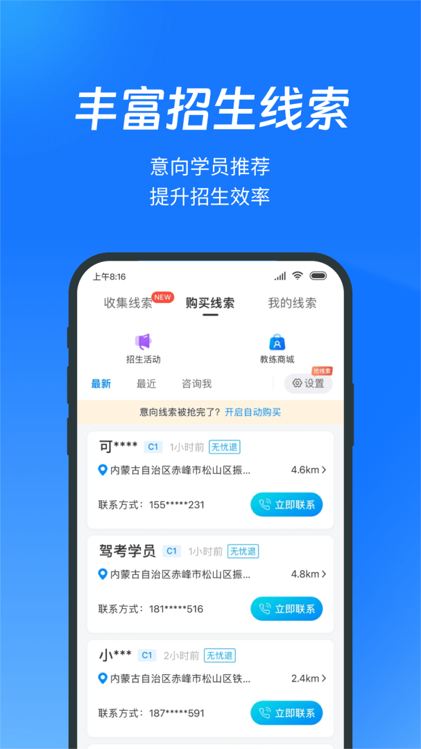 完全戳中驾校教练的痛点,依托驾考宝典的庞大用户池,能直接收到学员咨询,生源问题迎刃而解。内置超多招生素材和海报,还能一键生成微名片分享到社交平台,宣传超省心。从招生到后续跟进全搞定,堪称教练的 “获客利器”!