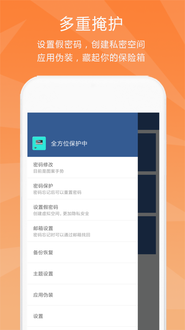 用户有什么隐私小秘密都可以在这里保护起来哦,直接锁住应用,别人想看也看不到,并且为了更加的保险,用户还可以在这里去进行多重的掩护,可以偷偷设置的一个假密码哦,应用也可以进行伪装,保证谁也打不开,用户就放心就可以了