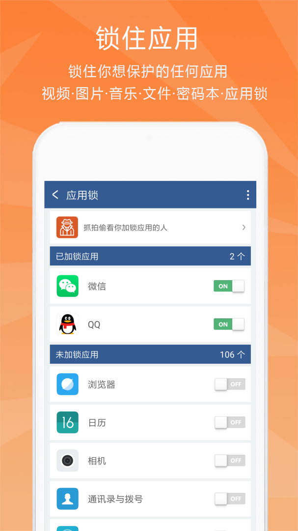 2、应用锁,用户随意添加隐私应用,让用户自己操作使用应用,避免被盗号;
