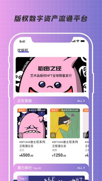 “优版权”是天河文链以区块链技术为核心、面向文化产业构建的版权数字资产流通应用。应用聚集数字艺术、科技潮玩、潮流音乐、明星影视、动漫游戏等各类内容,利用智能合约技术构建集IP、产品、数字权益于一体的版权数字资产,从机制上改变传统的文化作品确权难、维权难、流通难的问题,让文化更更有活力,让创意更有价值。