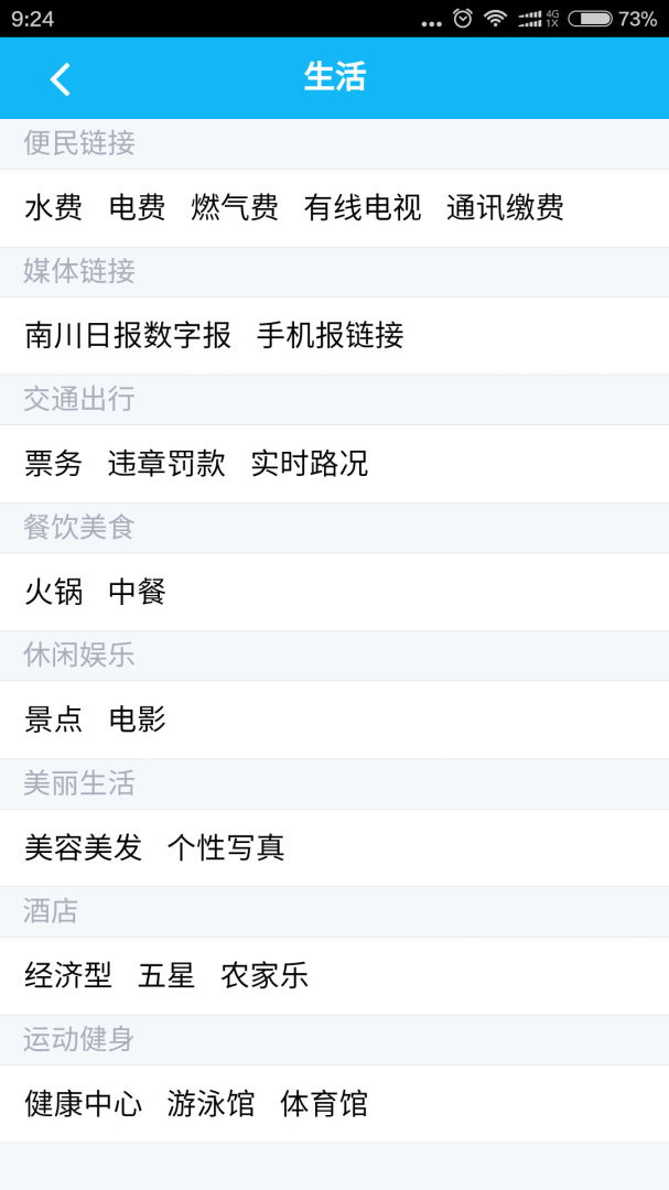 便民链接、媒体链接、交通出行、餐饮美食、休闲娱乐、美丽生活、运动健身。