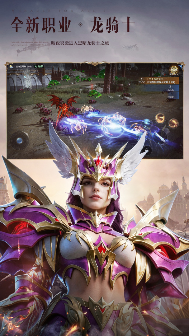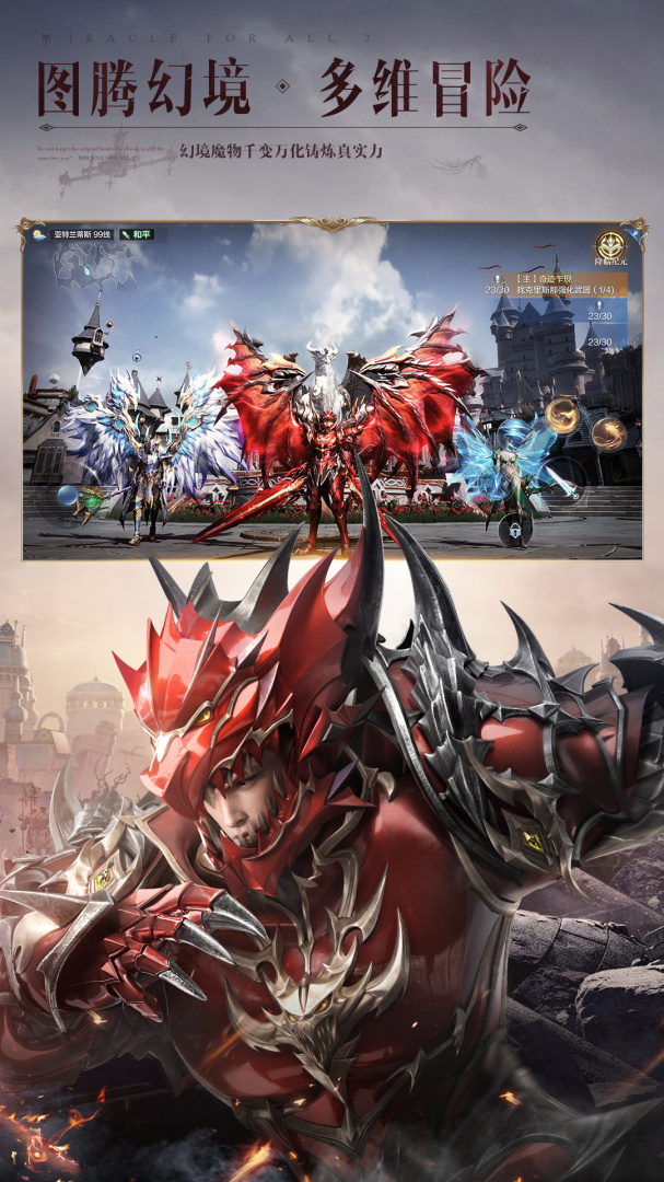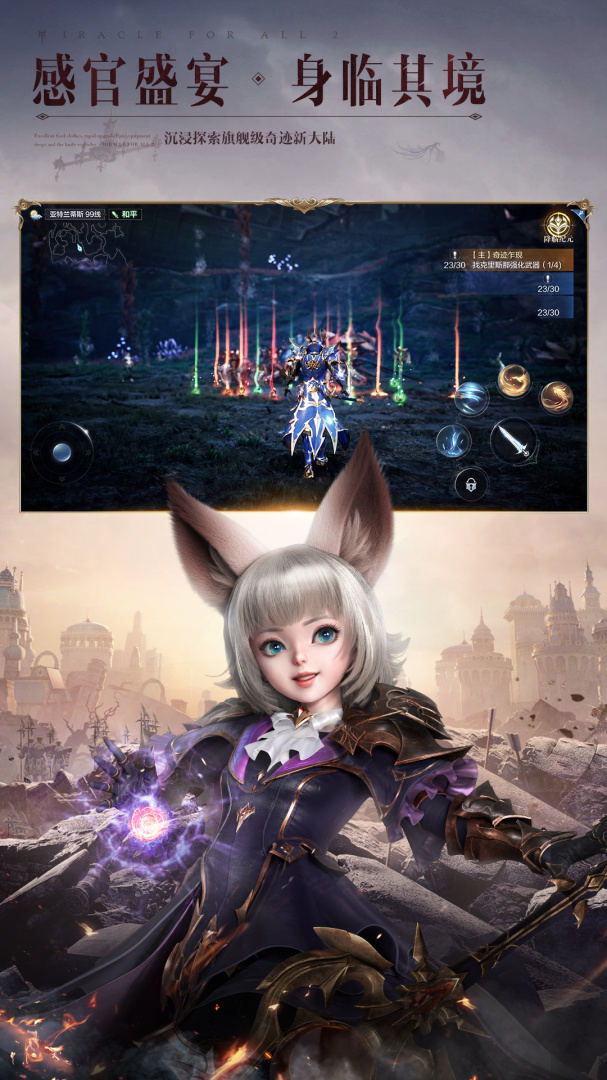 全民一起玩,才是真奇迹!《全民奇迹2》是一款腾讯旗舰级魔幻华丽手游。穿梭在UE4引擎演绎的华丽魔幻大世界里,身临其境般的沉浸体验。去感受,乘风翱翔展翅冲刺,掠过水面疾行在汹涌波涛中,体验海陆空三栖的无束缚探索;去战斗,具有魔法韵味的炫目技能,让每一次战斗都变成一场视觉盛宴;去成长,享受独特铠甲美学和流光羽翼的绚丽魅影。一起解禁你的无限魔幻想象。