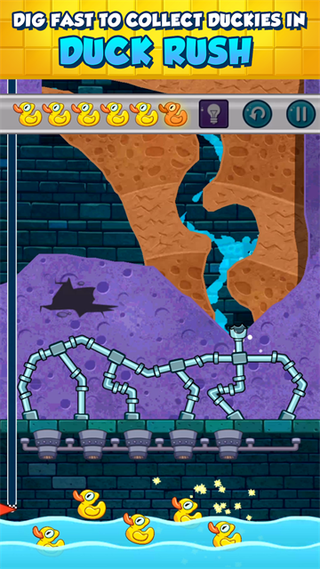 将左侧蓄水池下方挖出一个轨道,让水流穿过,然后淹没水管下方的第二只玩具鸭,获得第二个鸭子奖励。接下来,水流汇集到右下角的凹槽中。在大部分水流引到右侧后,在左侧蓄水池下方挖出第二个分流的轨道,让一部分水流进入到第三个玩具鸭子那里。