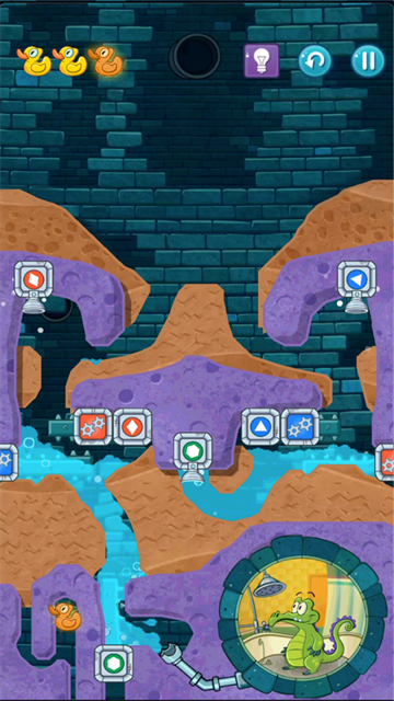 最后,我们可以看到,大部分水流都被引到了右下方的凹槽内。接下来,直接将凹槽下方的泥土挖去,让水流进入到小鳄鱼的浴室中,这一关就算通关了。