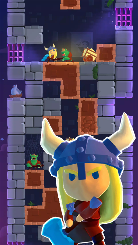 玩法简单,就是向下挖掘,路程上会遇见各种随机事件或者阻碍。有收集的元素,包括主角、跟随的伙伴还有道具。