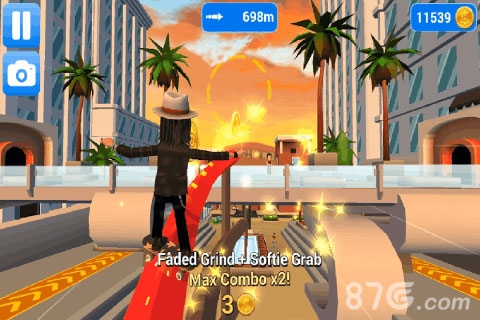 玩家在游戏中将帮助菲尔来穿越城市中的各个不同场景,如:繁华热闹的街道小巷,丰富多彩的房屋建筑物等,开始在城市中施展自己强力的滑板技能。而且在游戏中,菲尔可以通过不断的获取金币来升级自己,让自己的各个属性都是更加强力的,可以在游戏中滑的更远。而且玩家在游戏中的操作也是比较简单和直观的,只需简单的滑动屏幕或者点击屏幕就可以控制菲尔做出各种各样的特技动作。现在让我们在城市的街道中开启穿梭行走的技能,开启惊险刺激的跑酷之旅吧!