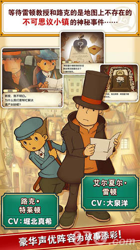 雷顿教授与不可思议的小镇是闻名全球的雷顿教授系列手机游戏,这个日系绘制的英伦绅士有着呆呆却又神奇的能力,本作是第一部作品的移动端版本,有着非常经典的设定,所有玩法能够感受到