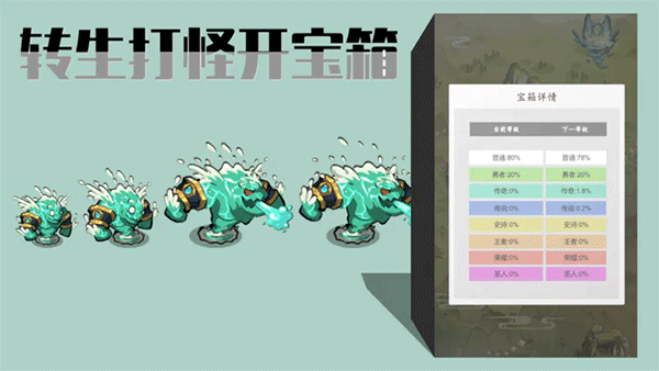 转生打怪开宝箱是一款轻松的休闲冒险养成游戏,采用放置玩法,玩家通过不断打怪升级,获取装备和资源,挑战BOSS并开启宝箱,提升角色实力。游戏操作简单,节奏轻松,适合喜欢挂机成长与探险乐趣的玩家。