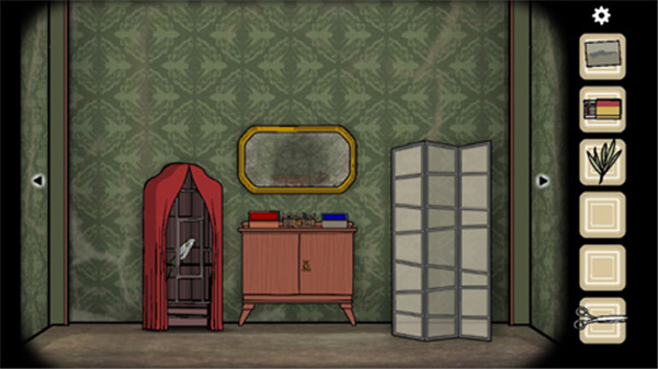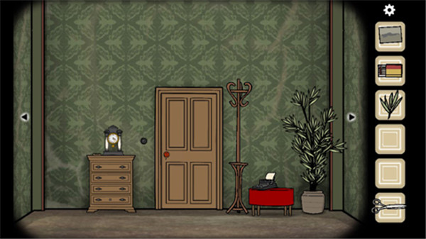 柜子上有个复读机,看来是放磁带的。旁边有打字机。还有一株植物。用剪子可以剪下来树叶。还有门旁边的开关开灯。灯里面有照片碎片。
