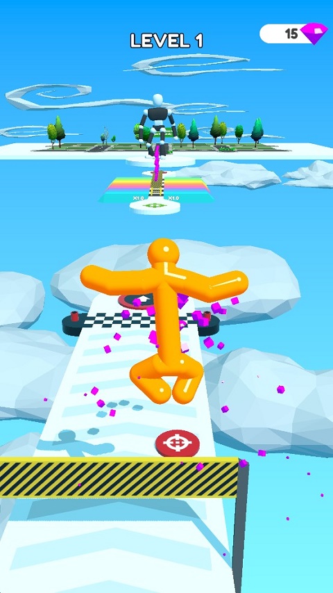 通过收集能量使火柴人角色动态变高变胖,膨胀后的角色呈现糖果般bulingbuling特效,体积越大越能摧毁关底机器人
