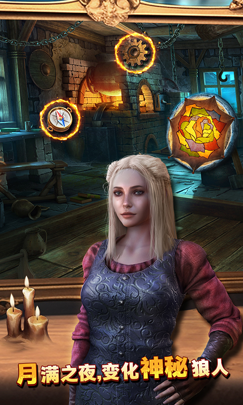 进入房子,右边壁炉捡起火的符号,用铲子铲灰,捡起框饰。左边地上,捡起火柴盒,小人。出门,在水车上用“火”打开柜子,得到