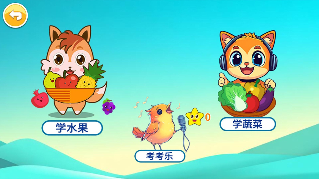 3、小朋友也可以选择水果的认知,里面有学水果和学蔬菜两块学习区域,提升小朋友对水果蔬菜的认识