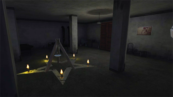 5、去地下室,在地下室墙上你会看见一个图,告诉你如果消灭鬼,左边可以找到一个指环,触发鬼用盐打败,右边可以找到汽油,最后把木材,油,指环放入游戏播放动画结束(如果先放入指环鬼会再次出现还是消灭她)。