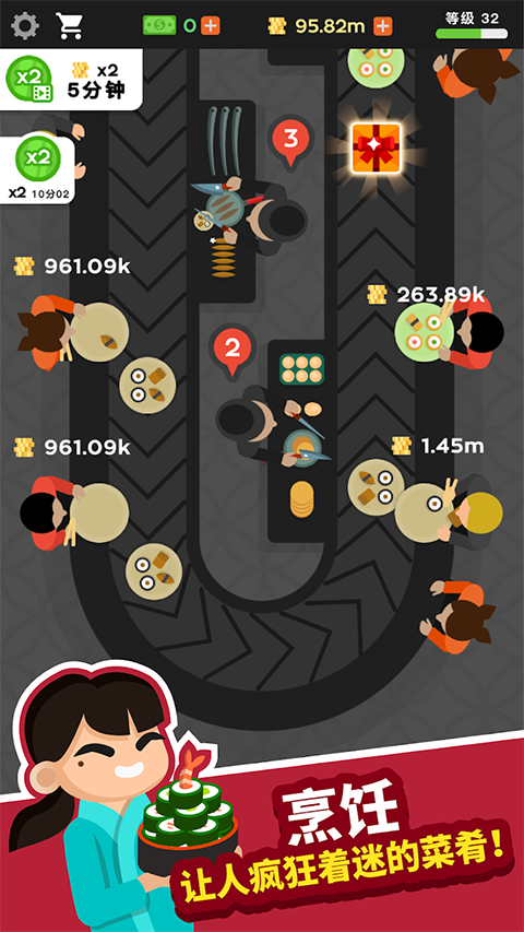 一款十分不错的模拟经营类游戏,游戏中玩家拥有自己的寿司餐厅,为了吸引更多的客人,玩家需要成为一名顶级厨师,烹饪美味佳肴,不断的推陈出新,迎合客人的口味制作各色美味寿司,扩大升级你的寿司餐厅以容纳更多的客人,喜欢的可以来放置寿司店进行体验