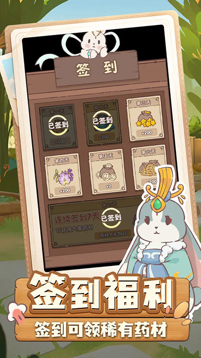 兔与药是一款十分治愈精美画质的模拟经营类的游戏,超级可爱的画风,玩家们可以和小兔子们一起冒险,收集各类药材,进行丹药的炼制,还可以制作出不同的药水,帮助更多的小伙伴,签到活动还有丰富奖励哦。