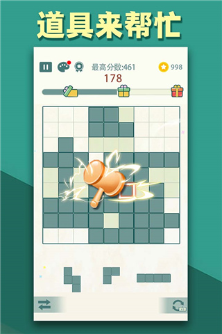 炫酷的游戏介面,形状各异的多彩方块,将方块拖进棋盘中,使各个不同形状的方块能够填满棋盘中的任意一个九宫格或者行列後消除得分。如何将更多的方块填进棋盘中是游戏的关键哦!方块一旦放置到棋盘中将无法移动,如何合理放置方块获得更多的消除分数,需要你保持聪明的头脑和清晰的思路。