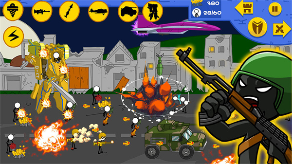 使用了火柴人的游戏形象,非常受人喜爱,游戏中我们控制着自己的火柴人在街道上到处搜寻道具,当然街道上还有其它的敌军火柴人,可以与之作战