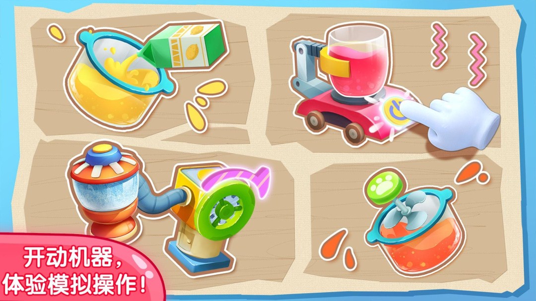 游戏中孩子可以操作酷炫机器,体验趣味操作,还可以创意果汁包装,让孩子在游戏中学到更多知识。