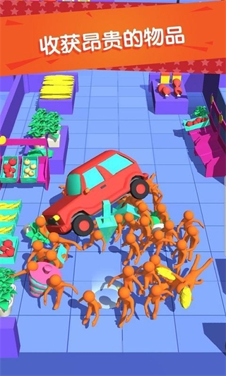 成为最会购物的人,将超市一扫而空,只要将你的物品,在规定的时间带到指定位置,那么这些物品将都是你的了。你可以召唤更多的帮手来帮助你,毕竟像汽车这么大的商品,一个人是很难将其带回的,所以人多力量大这句话就非常适合这个游戏了。经典的橡皮人游戏画风,趣味休闲的游戏玩法,赶紧参与吧