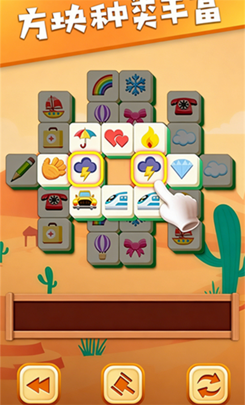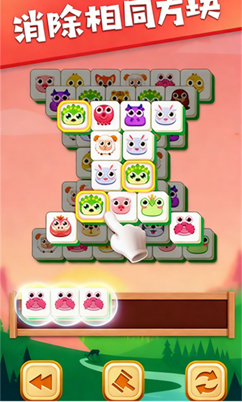 通过点击方块,将三个相同图案的方块放进盒子里就能自动消除,消除速度快还可以获得连击,得到更高的分数哦。盒子里可以放下7个方块,若盒子里超过7个方块则游戏失败。