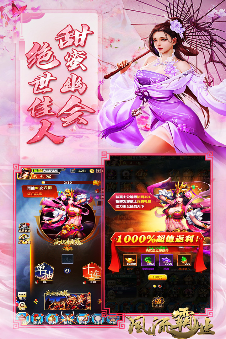 风流霸业是一款充满三国元素的策略角色扮演游戏,以东汉末年为背景,玩家将化身为一位小城的年轻主宰。在这个虚拟世界中,你可以培养诸多历史名将,与他们并肩作战,体验各种精彩的玩法,如美人侍寝、儿女联姻以及激烈的校场比试。是讨伐逆贼还是与其他势力争夺资源,玩家都能在众多挑战中争取权力和荣耀。更有丰富的养成系统,让你自由构建个性武将和战术阵容。这款游戏鼓励放松心态,可以轻松挂机,带给玩家无尽乐趣。快来展示你的才能,书写属于自己的三国传奇吧!