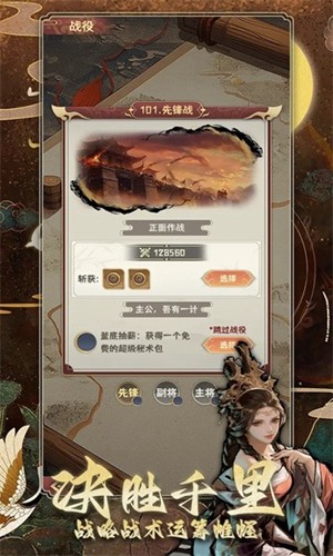 英雄推荐,一般游戏都是五星比四星强得多,但这个游戏认真玩下来的话,很多四星角色的上限甚至比五星还高。比如祝融,前期可以无脑打出「五星连珠」阵型,通过高级阵型效果轻松度过发育期;而步练师则可以获得大量铜钱利息,以此加快发育;还有马云禄、黄舞蝶这种,专门针对一个兵种进行设定的武将,技能也十分有特色,可以根据每个人的喜好来玩出不同流派打法,可以多多体验,找出最适合自己的打法,冲破游戏的上限!