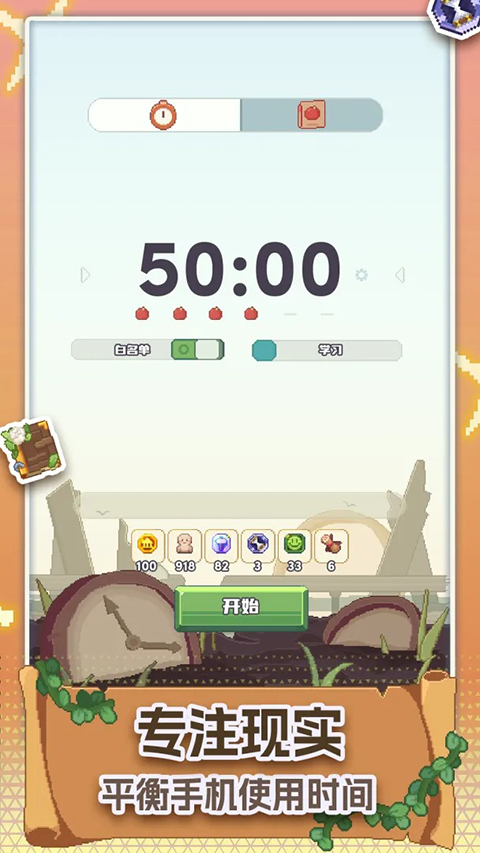 玩家需要开启一个番茄钟计时,然后放下手机专注于生活中更重要的事情(学习、读书、工作)。游戏将会阻止你访问手机里的其他应用,直到计时结束。计时成功后,玩家将获得对应的资源用来发展自己的文明。