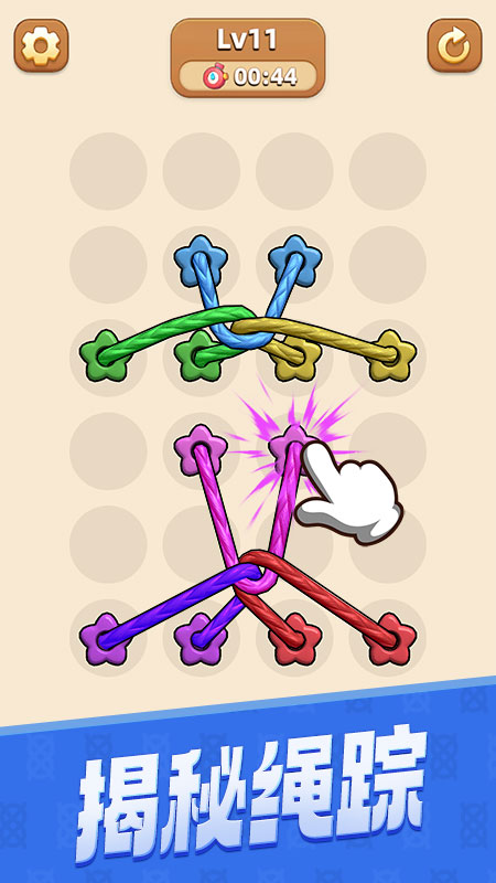看到这个游戏,先不要急着失望,虽然乍一看玩法简单,平淡无奇,但实际上时我们可以在这里体验到一个经典的解谜游戏乐趣,这个解绳子中玩家的任务就是要想办法把打成各种模样的绳结给解开,操作简单但是对于玩家的观察和判断力的要求非常的高,不服就来试试吧
