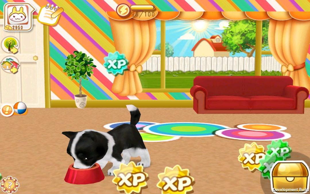 2、触屏互动:抚摸小狗,喂食喂水,为小狗洗澡,与小狗玩耍;