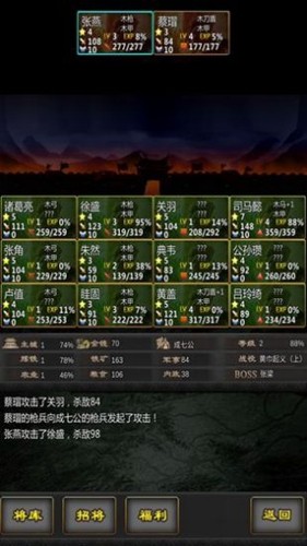 2、放置系统:不同属性的武将作用不同,魅力高的管理内政,智力高的可以带军征战