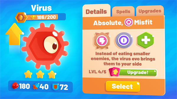 1、-升级和进化:每个Evo品种都有独特的技能,例如跳跃或滑坡。 这些属性可以升级,以使您的Evo更加强大。