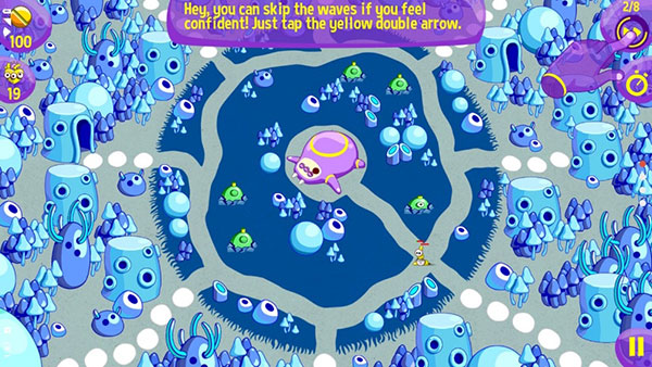 这是睡意侵袭这款塔防游戏最具特色的玩法,玩家可以通过在游戏中旋转战场来改变怪物的经过路线。整个游戏都是由一个圆形的地图组成,从圆的边缘处有几条长度不同的曲线通向圆心处,敌人们就是从这些路线进攻,玩家可以选择一条较远的路线旋转让怪物从这条路上过来,这样就能够给我们布阵留出足够的时间了。