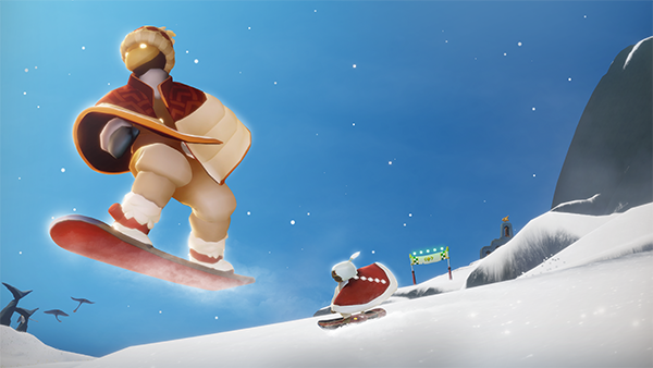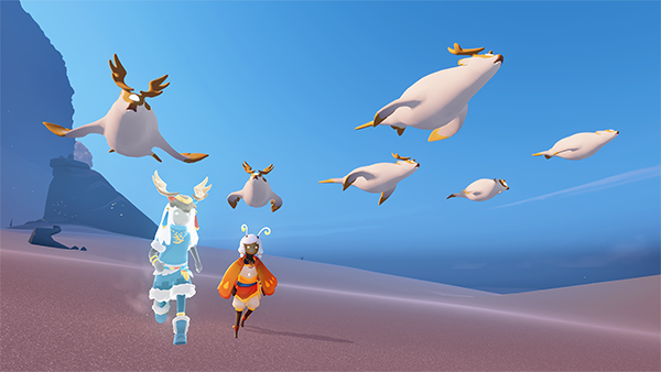 3、找到黄色人影,与它们互动 收集“光之翼”,我们的 飞行技能就可以得到 升级――斗篷背后 星星的数量就代表我们的飞行级别。