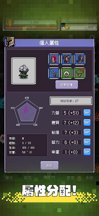 1、进入勇者大人的刷怪城之后,我们先点击左下角的【属性】按钮,将前任勇者的各项属性继承过来。