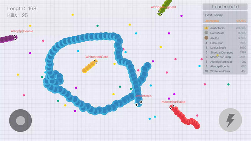若非常不幸,你的蛇蛇被人围住了,不要灰心!继续绕下去,并且尽量往对方蛇蛇的头部方向移动,尽力地绕最大圈的移动。对于大蛇蛇来说,他的命更加值钱!也可以联合你的小伙伴一起限制大蛇蛇的绕圈路线,逼迫他失误。若是可以反杀,可以大大壮大你的长度!
